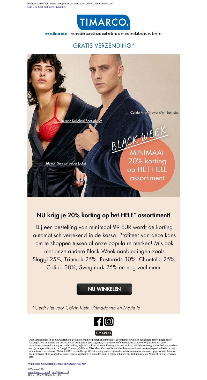 Black Week is hier met minimaal 20% korting op het hele assortiment van Timarco. Bij bestedingen vanaf 99 EUR wordt de korting automatisch verrekend. Mis geen andere aanbiedingen zoals Sloggi 25% en Triumph 25%. Gratis verzending en een enorme selectie wachten op jou.