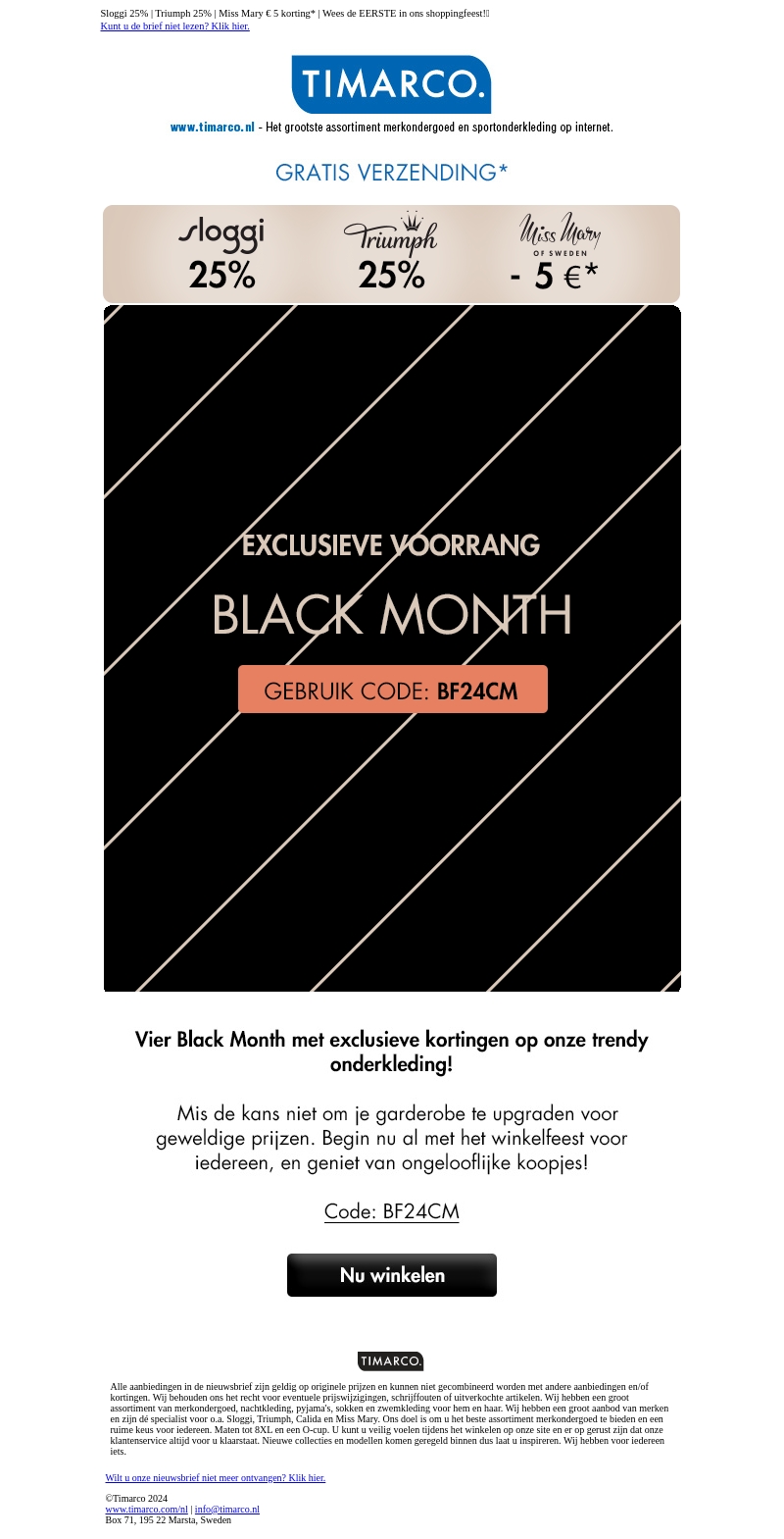 Wees de eerste die profiteert van exclusieve kortingen tijdens Black Month bij Timarco. Ontvang tot 25% korting op merken zoals Sloggi en Triumph. Gebruik de code BF24CM en geniet van gratis verzending. Begin nu aan uw winkelavontuur en upgrade uw garderobe voordelig.