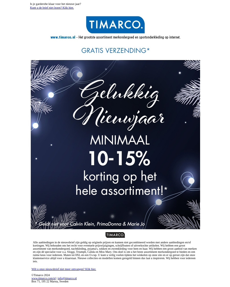 Gelukkig Nieuwjaar van Timarco! Begin het jaar met een geweldige aanbieding: minimaal 10-15% korting op het hele assortiment. Of je nu zoekt naar ondermode, nachtkleding of sportkleding, wij hebben alles wat je nodig hebt. Mis de kans niet om van deze exclusieve nieuwjaarsactie te profiteren. Bekijk onze collectie online en ontdek jouw favorieten!