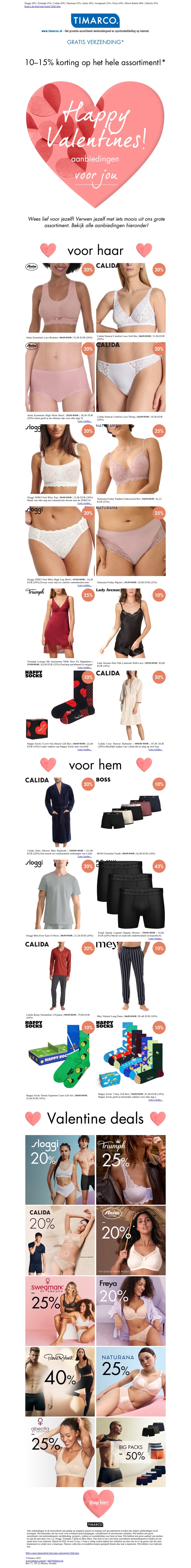 Vier Valentijnsdag met geweldige kortingen op ons hele assortiment. Profiteer van 10–15% korting op stijlvolle ondermode en comfortabele kleding voor haar en hem. Mis deze kans niet om je zelf of je geliefden te verwennen. Ontdek populaire merken zoals Sloggi, Calida en Freya. Heb een fijne Valentijnsdag met onze fantastische deals!