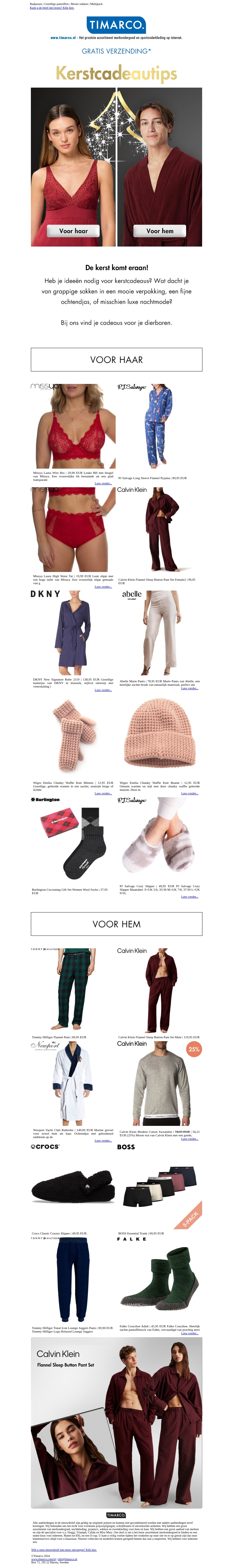 De kerst komt eraan en het is tijd voor cadeautips! Ontdek onze selectie van zachte en mooie geschenken voor zowel vrouwen als mannen. Van luxe onderkleding tot comfortabele nachtkleding, er is voor ieder wat wils. Verwen jezelf of je geliefden met deze stijlvolle cadeaus. Bekijk onze exclusieve aanbiedingen en ontvang gratis verzending.