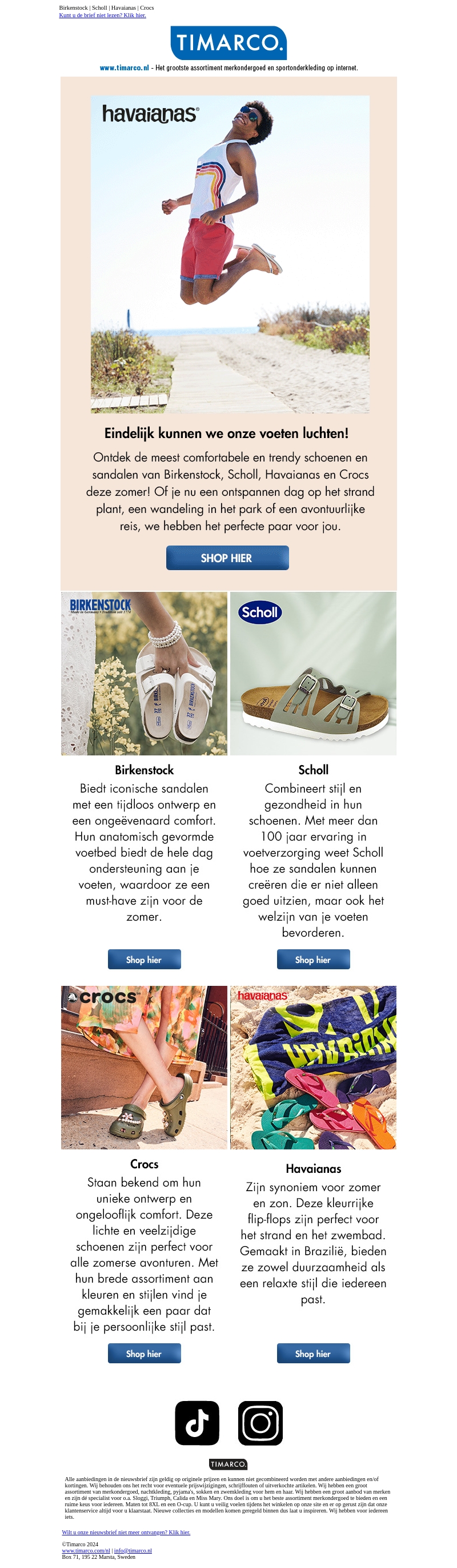 Eindelijk kunnen we onze voeten luchten! Ontdek de meest comfortabele en trendy schoenen en sandalen van Birkenstock, Scholl, Havaianas en Crocs deze zomer. Of je nu een ontspannen dag op het strand plant, een wandeling in het park of een avontuurlijke reis, we hebben het perfecte paar voor jou.