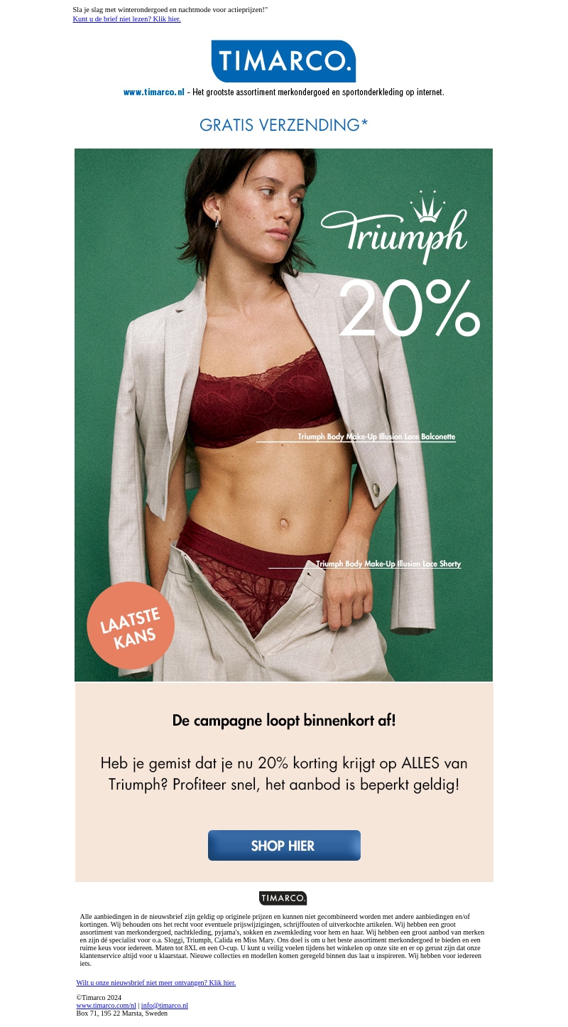 Grijp nu je kans met 20% korting op alle Triumph producten bij Timarco. Mis deze exclusieve aanbieding niet en geniet van gratis verzending. Het aanbod is beperkt, dus wees er snel bij om te profiteren van deze geweldige deal.