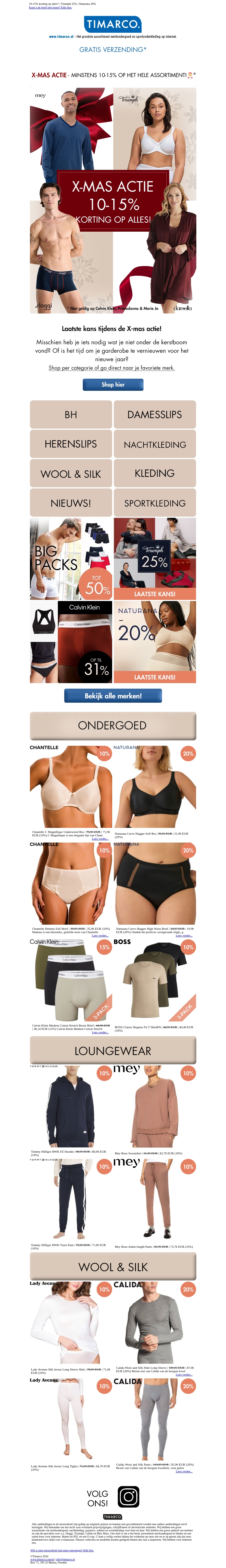 Mis de X-MAS actie niet! Ontvang tot 15% korting op het volledige assortiment, inclusief ondergoed, nacht- en sportkleding. Profiteer van kortingen tot 50% op grote verpakkingen en 20% op bekende merken zoals Mey, Chantelle, en Calida. Geniet van de feestdagen in comfort met onze loungewear en wol & zijde collecties. Klik nu om je favoriete merken te shoppen.