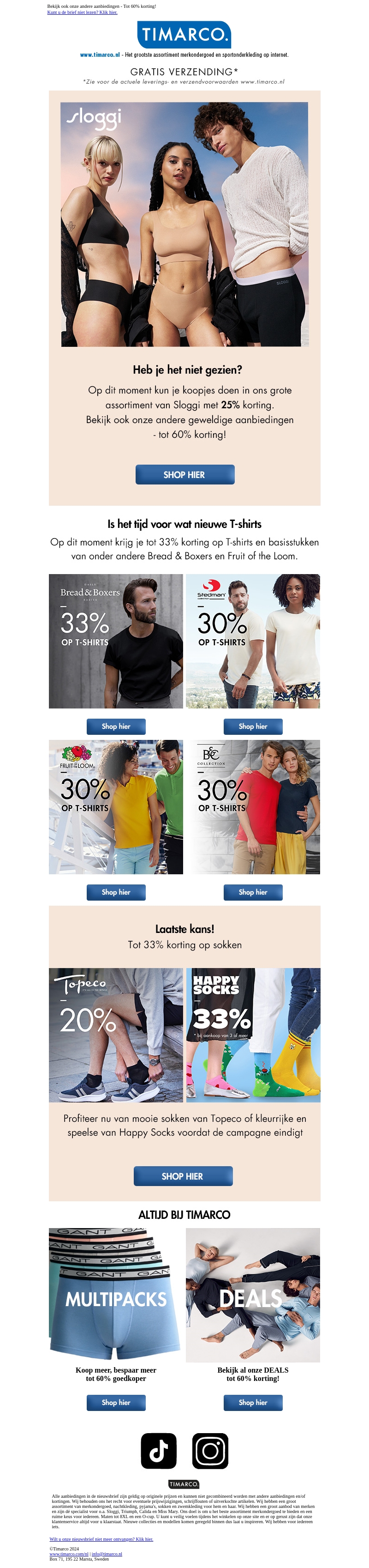 Ontdek de nieuwste aanbiedingen bij Timarco! Ontvang 25% korting op het assortiment van Sloggi. Daarnaast zijn er kortingen oplopend tot 60% op diverse merken, inclusief T-shirts van Bread & Boxers en Fruit of the Loom, en sokken van Topeco en Happy Socks. Profiteer nu van deze kortingen voordat de campagne eindigt!