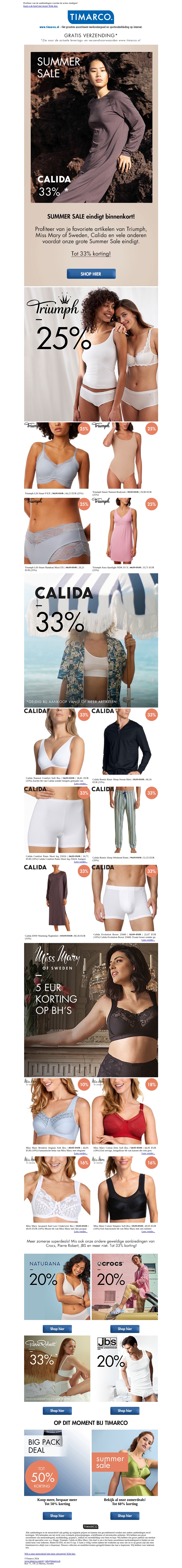 De zomeruitverkoop eindigt binnenkort bij Timarco! Profiteer van kortingen tot 40% op je favoriete artikelen van merken zoals Triumph, Miss Mary of Sweden, Calida en meer. Wacht niet te lang, sla snel je slag voordat de kortingen verdwijnen! Ontdek het volledige aanbod op onze website.