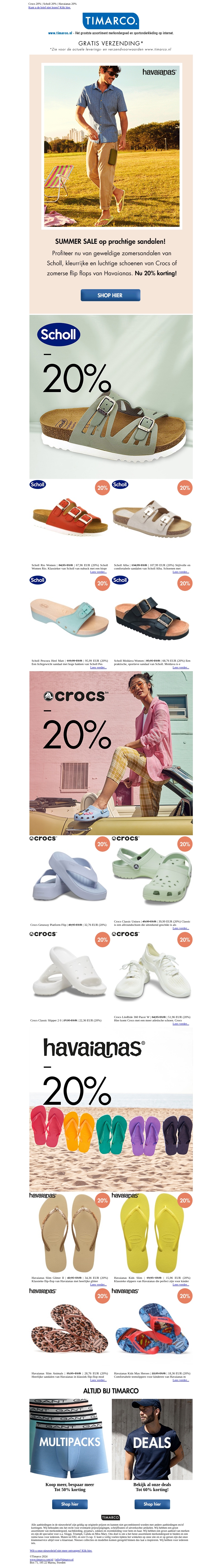 Profiteer nu van kortingen tot 20% op prachtige zomersandalen! Bekijk onze selectie van Scholl, Crocs en Havaianas en vind de perfecte sandalen voor jouw zomeravonturen. Mis deze kans niet en shop nu de beste deals bij Timarco.