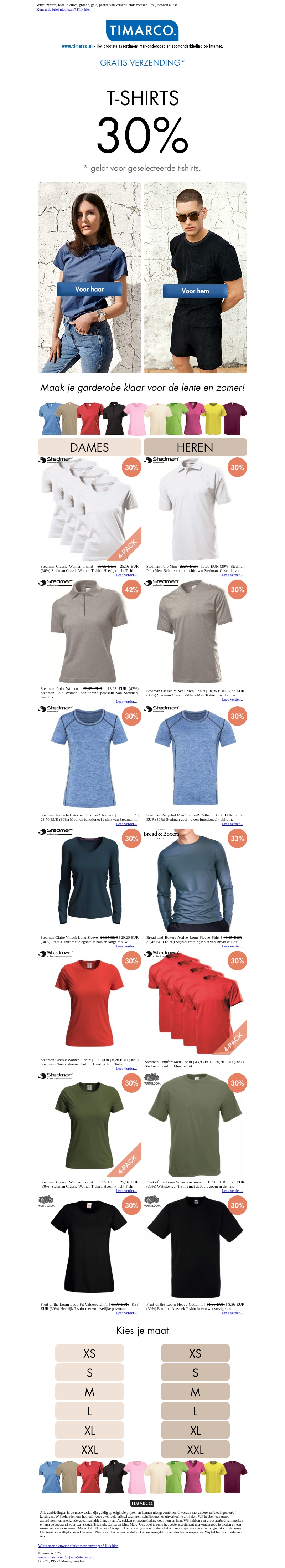 Vernieuw je garderobe met 30% korting op geselecteerde t-shirts! Kies uit een uitgebreide collectie voor zowel dames als heren. Perfect voor frisse voorjaarsdagen en zonnige zomers. Gratis verzending en snelle service. Shop nu en combineer naar hartelust!