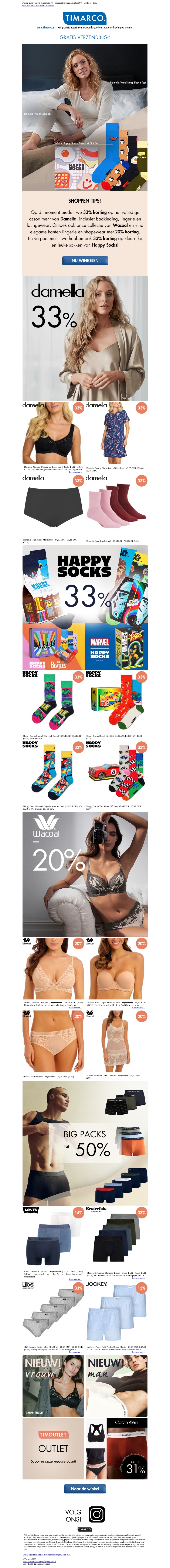 Geniet van geweldige kortingen bij Timarco. Damella en Happy Socks bieden nu een korting van 33%. Het is je kans om luxe nachtmode van Damella te kopen of vrolijke sokken van Happy Socks. Daarnaast kun je ook profiteren van kortingen op merken zoals Wacoal, Björn Borg en meer. Voor de beste deals en nieuwe aanbiedingen, bezoek onze website.