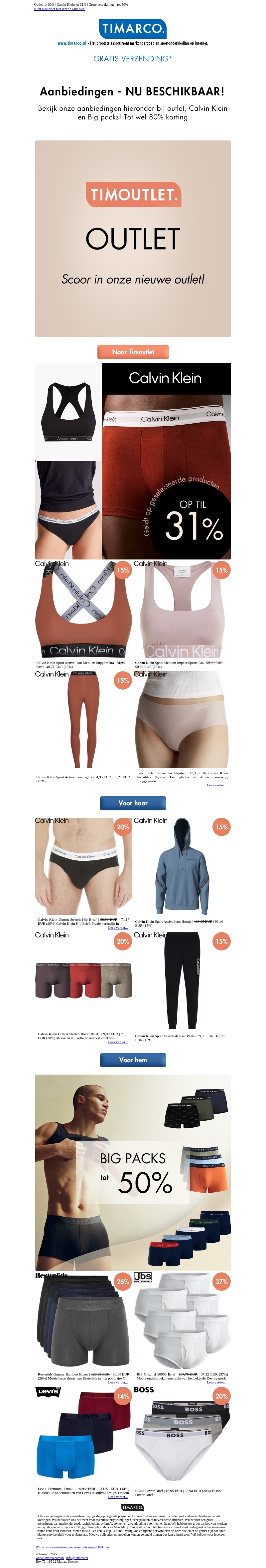 Beleef een fantastische winkelervaring met kortingen tot wel 80% bij Timarco Outlet. Van Calvin Klein tot Levi's, u vindt premium merken voor een fractie van de prijs. Blader door onze exclusieve selectie ondergoed, sportbeha's en loungewear. Perfect voor een garderobe-update zonder hoge kosten. Mis deze unieke verkoopkansen niet.