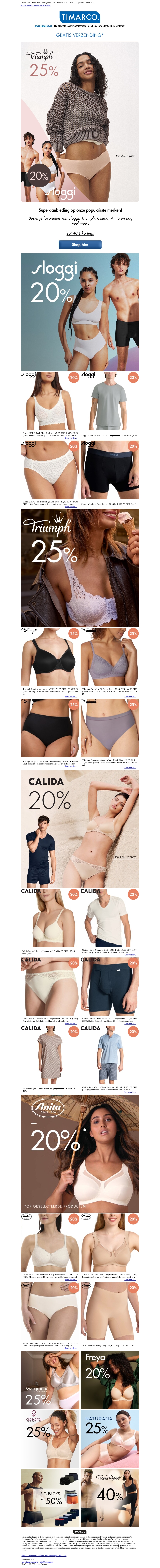 Profiteer van geweldige kortingen op uw favoriete ondergoedmerken. Ontvang 20% korting op Sloggi en 25% korting op Triumph. Of je nu op zoek bent naar iets comfortabels of stijlvols, deze aanbiedingen hebben voor ieder wat wils. Bekijk de laatste collecties en geniet van enorme besparingen. Shop vandaag nog en mis het niet!