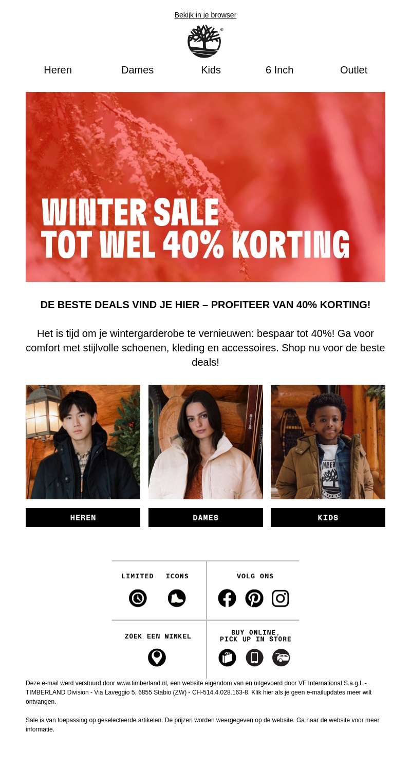 Het is tijd om je wintergarderobe te updaten met kortingen tot wel 40%! Ontdek de nieuwste stijlen voor heren, dames en kinderen. Ga voor comfort met hoogwaardige kleding en accessoires. Mis deze geweldige deals niet en shop vandaag nog.