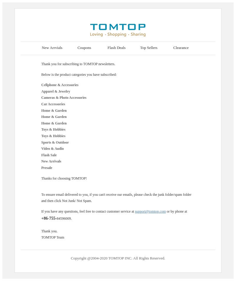 Thanks for your subscribing to TOMTOP newsletters.