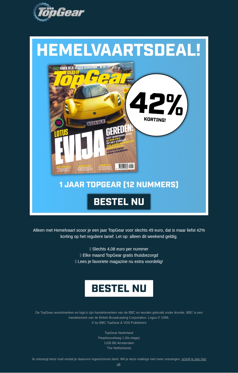 Hemelvaartsdeal: 1 jaar TopGear met 42% korting (alleen dit weekend)
