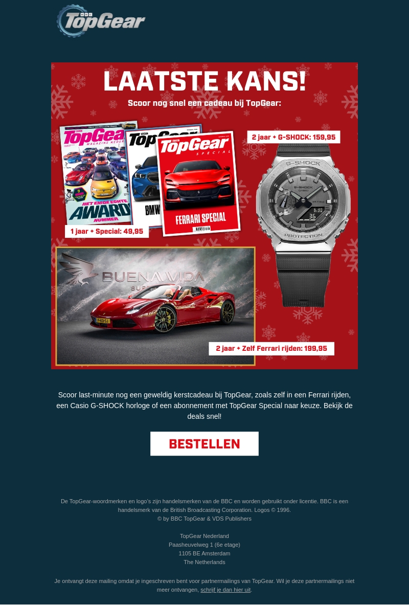 Nog op zoek naar een speciaal kerstcadeau? TopGear biedt fantastische deals, zoals rijden in een Ferrari, een Casio G-SHOCK horloge, of een jaarabonnement met een TopGear Special. Bekijk snel de aanbiedingen en scoor het perfecte cadeau voor autoliefhebbers.