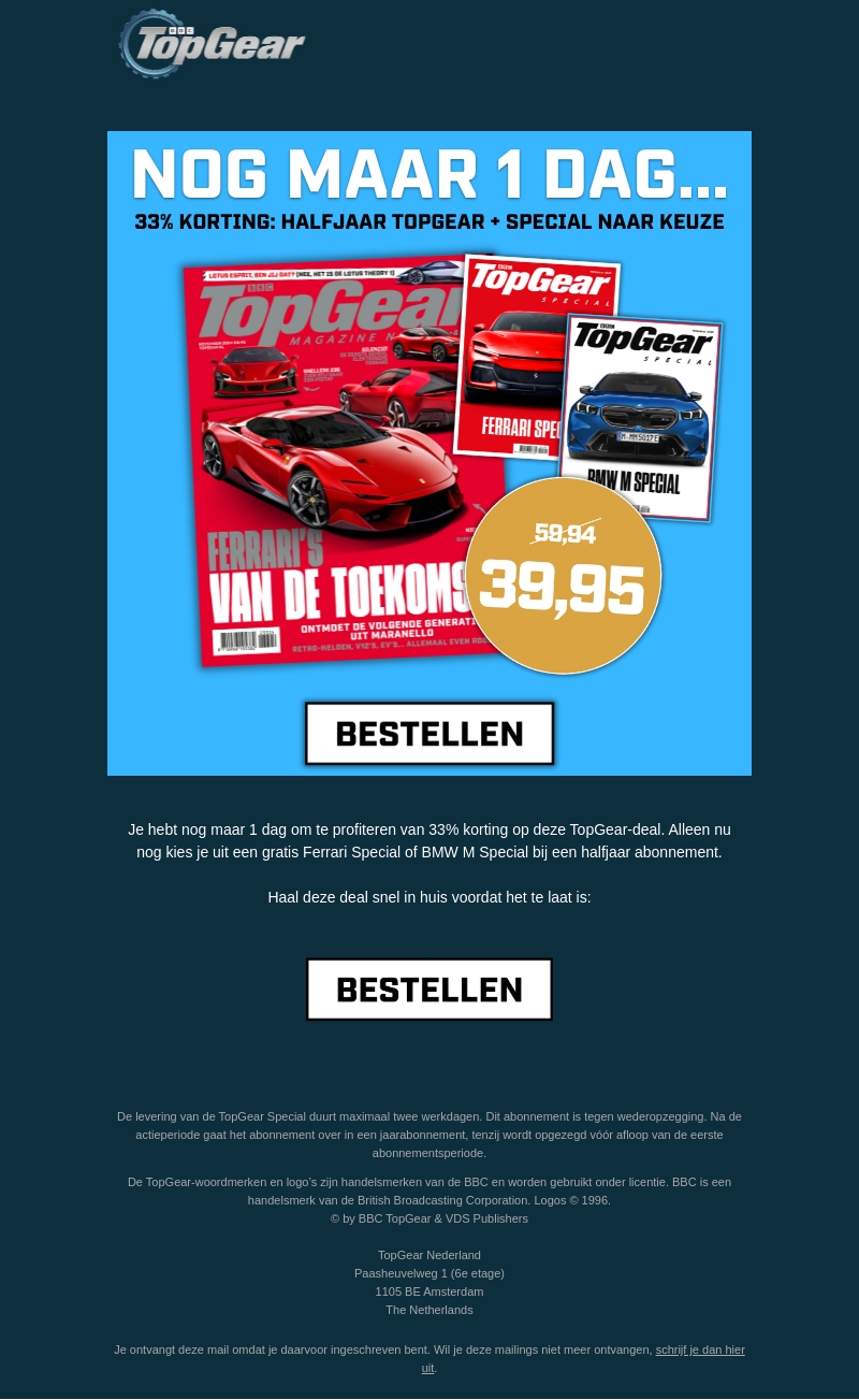 Grijp je kans en profiteer van een enorme korting van 33% op een halfjaarabonnement van TopGear. Bij deze aanbieding ontvang je ook een gratis Ferrari Special of BMW M Special. Wees er snel bij, want deze deal is slechts 1 dag beschikbaar. Bestel nu en haal de nieuwste autonieuws en specials in huis.