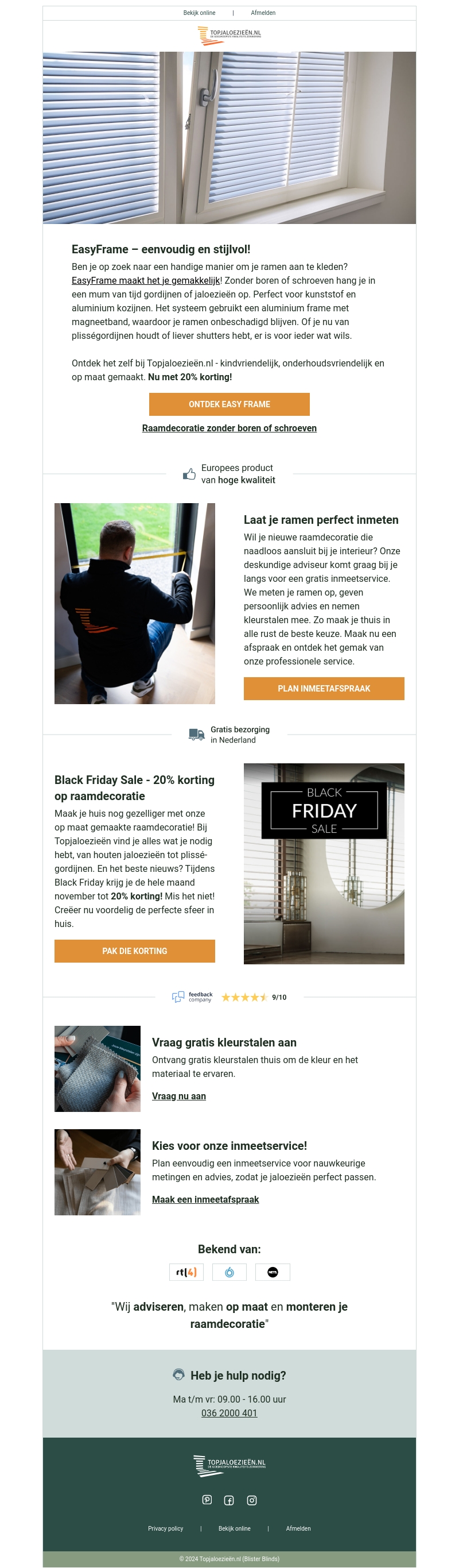 Ontdek de elegante en eenvoudige EasyFrame raamdecoraties van Topjaloezieën.nl, ideaal voor kunststof en aluminium kozijnen. Nu met 20% Black Friday korting, zonder boren of schroeven. Laat je jaloezieën perfect inmeten en ontvang gratis kleurstalen. Bestel nu en geniet van deze tijdelijke aanbieding.