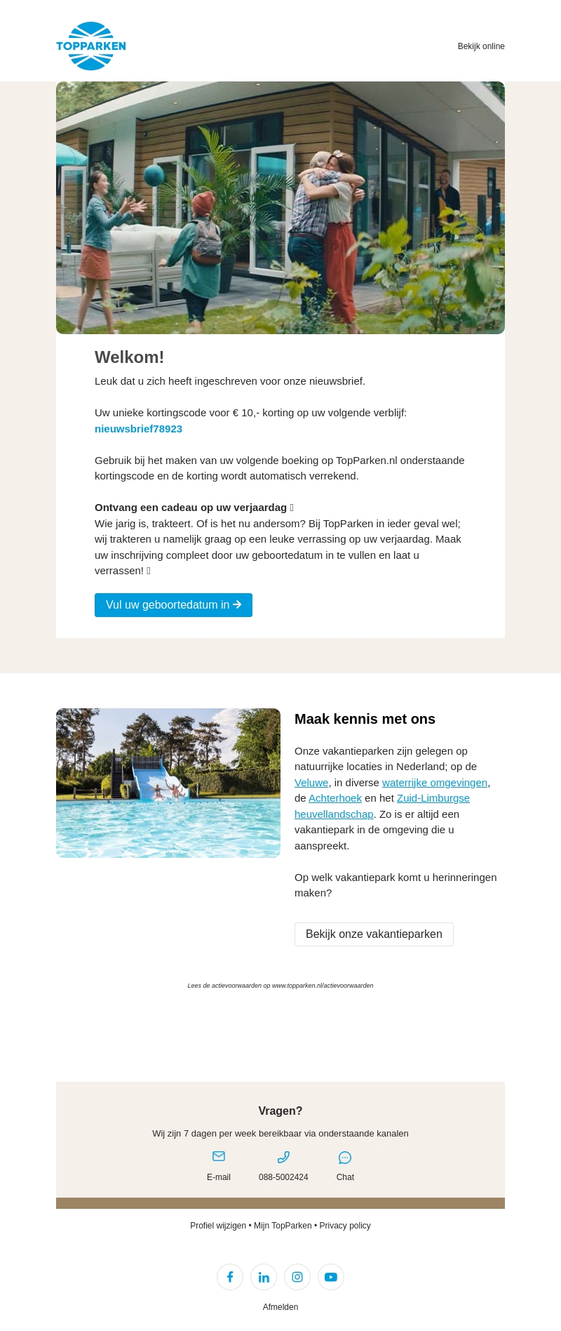 Leuk dat u zich heeft ingeschreven voor onze nieuwsbrief. Gebruik uw kortingscode voor € 10 korting op uw volgende verblijf bij TopParken. Bekijk onze diverse locatie-opties en begin uw vakantieavontuur vandaag nog!