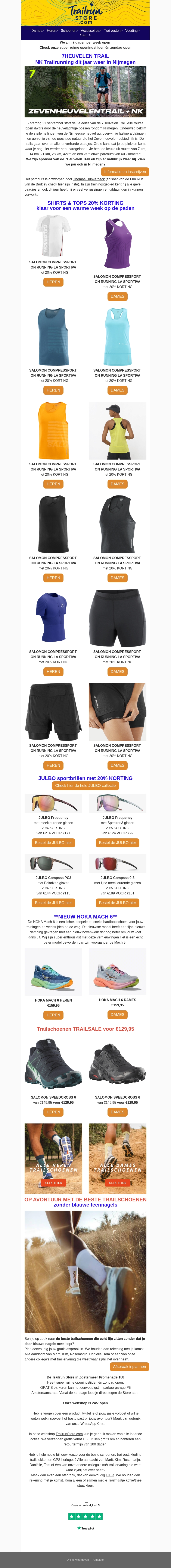 De 7HeuvelenTrail vindt dit jaar plaats in Nijmegen. Bereid je voor met de nieuwste compressiesportkleding van Salomon. Profiteer van 20% korting op shirts, tops en sportbrillen. Bekijk ook de nieuwste Hoka Mach schoenen voor extra comfort tijdens het rennen. Ga op avontuur met de beste trailschoenen, nu ook in de sale voor €129,95.