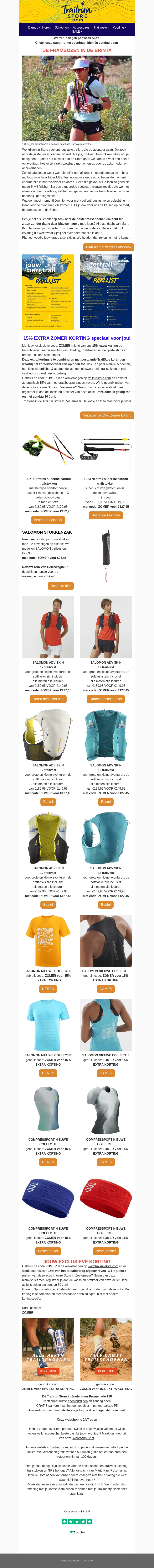 Check de nieuwste trailrunning gear bij Trailrun Store en profiteer van een exclusieve zomerkorting van 15%. Ontdek onze selectie van rugzakken, stokken en kleding die jouw avontuur compleet maken. Mis deze kans niet om jouw uitrusting te upgraden.