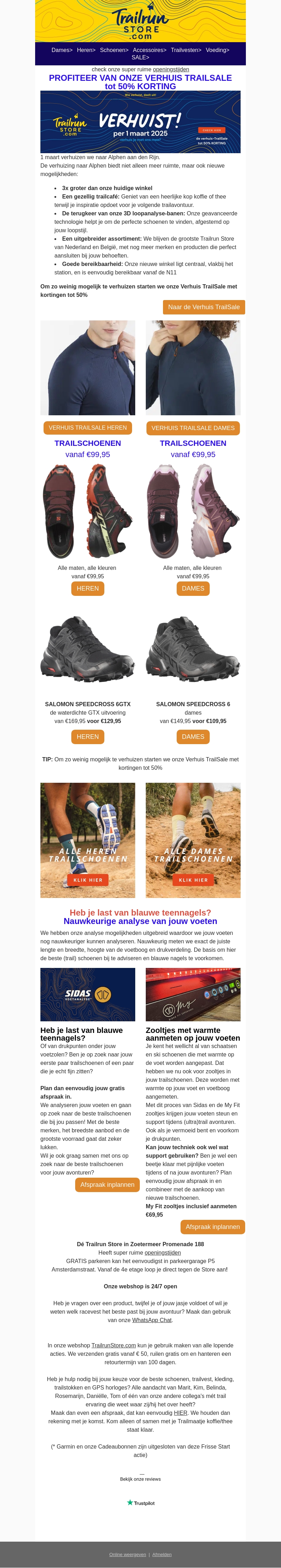 Verhuis TrailSale biedt tot 50% korting op diverse artikelen terwijl wij naar onze nieuwe locatie verhuizen. Ontdek geweldige deals op trailschoenen voor zowel heren als dames en neem een kijkje in ons uitgebreide assortiment. Dit is de perfecte tijd om je uitrusting te upgraden met onze aanbiedingen. Kom langs of shop online op onze 24/7 beschikbare webshop.