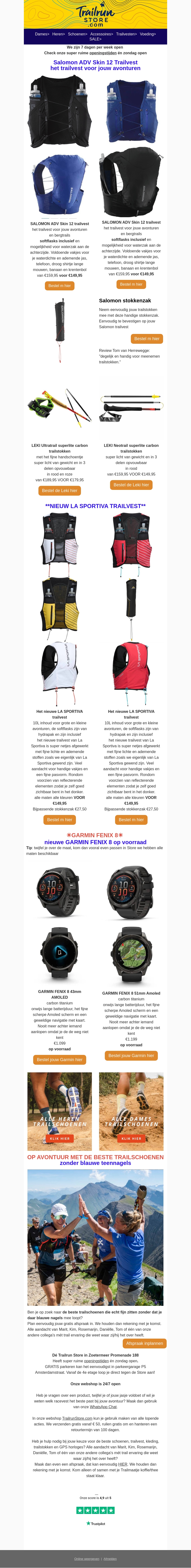 Introductie van de nieuwste collectie Garmin horloges en La Sportiva trailvesten, perfect voor buitenavonturen. Bezoek nu onze winkel en ontdek welk vest of horloge het beste bij je past. Profiteer van de nieuwste technologieën en comfortabele ontwerpen. Bekijk ook onze selectie beste trailrunning schoenen voor een ultieme ervaring.
