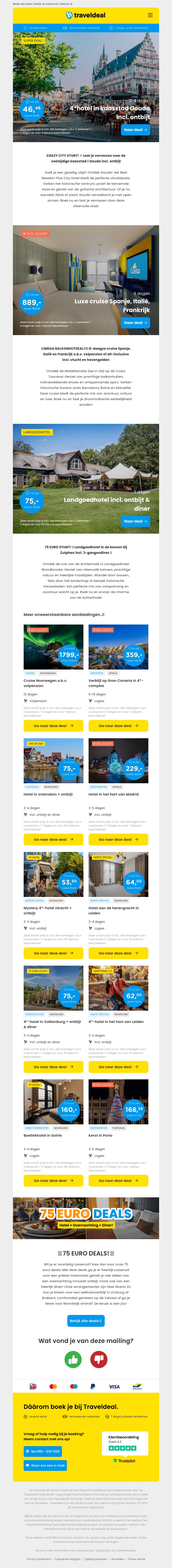 Ontdek vier nieuwe parels bij TraveIdeal! Geniet van een verblijf in een 4*-hotel in Gouda, een luxe cruise door Spanje, ItaliΓ« en Frankrijk, of een verblijf in een prachtig landgoedhotel in de Achterhoek. Mis deze exclusieve deals niet en profiteer van gratis upgrades en kortingen!