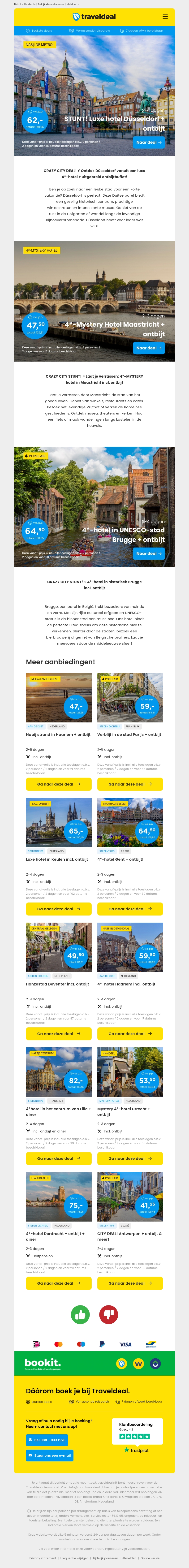 Mis deze geweldige stadsdeals niet! Bezoek Düsseldorf voor slechts €62, Maastricht voor €47,50 en Brugge voor €64,50, allemaal inclusief ontbijt en overnachting in top hotels. Daarnaast zijn er nog vele andere aanbiedingen zoals Antwerpen en Rotterdam. Boek nu en profiteer van deze limited-time aanbiedingen!