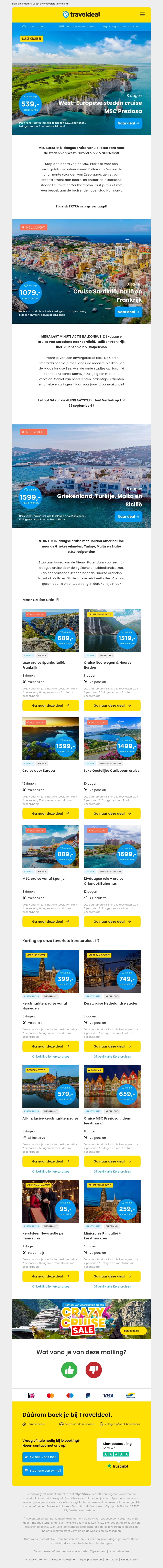 Mis deze exclusieve aanbiedingen niet! Reis naar bestemmingen zoals West-Europa, Italië, Frankrijk en meer, allemaal inclusief volpension. Ook beschikbaar zijn speciale Kerstcruises. Plan je droomvakantie vandaag nog en bespaar groot met onze crazy cruise sale!