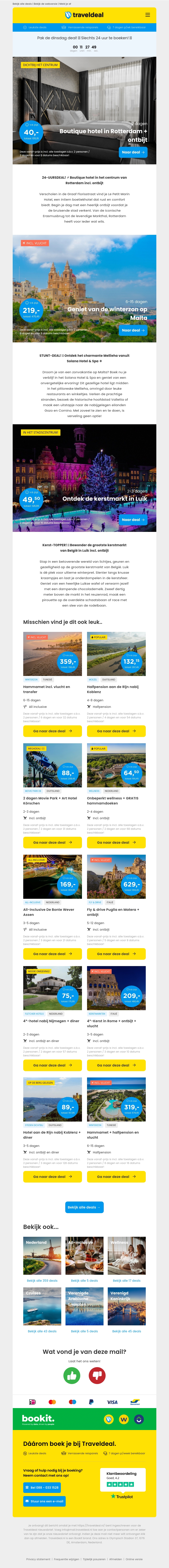 Profiteer van de Dinsdag-Deal en verblijf in een luxe boutiquehotel in Rotterdam voor slechts €40 per persoon inclusief ontbijt. Verder in deze nieuwsbrief vindt u ook speciale aanbiedingen zoals een vakantie naar Malta en een kerstmarkt in Luik. Mis deze fantastische deals niet!