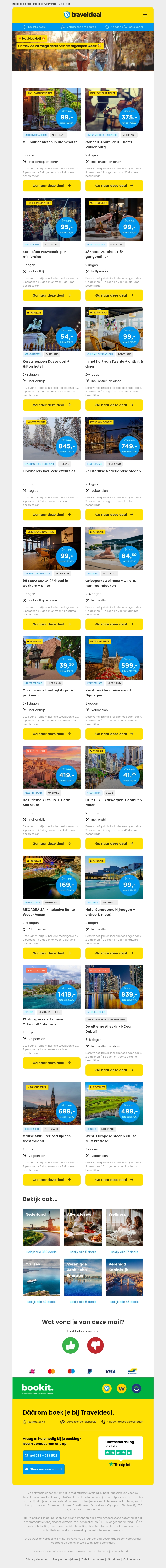 Verlies geen tijd en ontdek de 20 mega deals van deze week! Profiteer van verbluffende kortingen op reisbestemmingen. Of je nu op zoek bent naar avontuur, ontspanning, of cultuur - er is voor ieder wat wils. Zorg dat je niets mist en boek nu je volgende vakantie met Traveldeal. De aanbiedingen zijn maar tijdelijk beschikbaar!