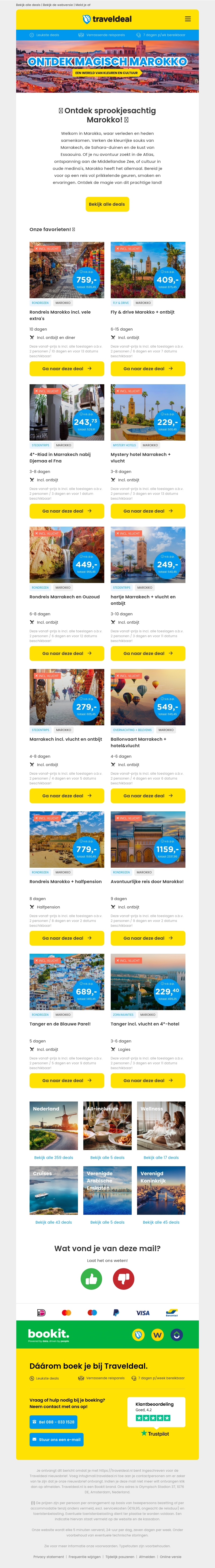 Beleef de magie van Marokko met Traveldeal! Van de kleurrijke markten in Marrakech tot de serene woestijnen, ervaar de veelzijdigheid van deze prachtige bestemming. Met scherpe deals voor de beste hotels en onvergetelijke excursies, zorgen wij voor een avontuur van je leven.