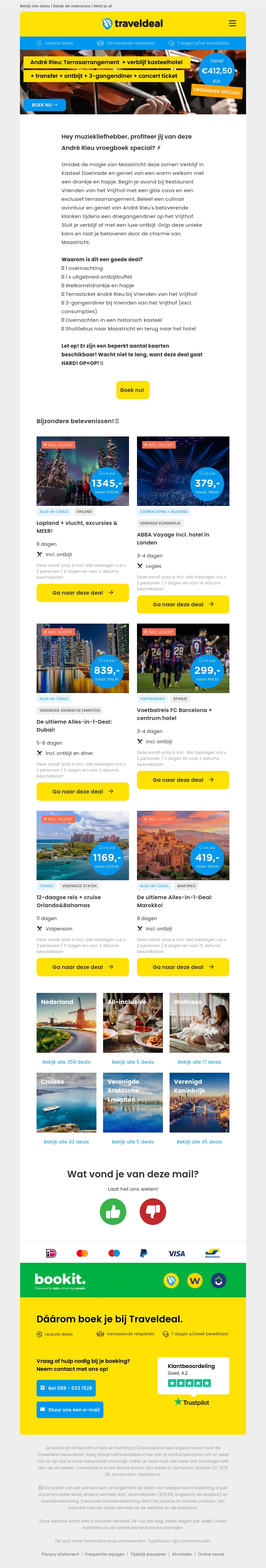 Beleef André Rieu live met een speciaal terrasarrangement inclusief verblijf in een kasteelhotel. Geniet van een inbegrepen transfer, ontbijt, en een heerlijk 3-gangendiner. Boek nu voor €412,50 per persoon en ervaar deze onvergetelijke avond.