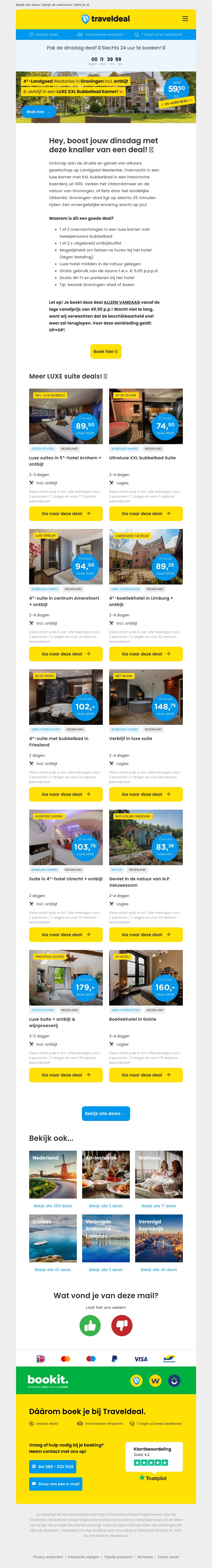 Boost je dinsdag met deze exclusieve Traveldeal. Geniet van luxe suites inclusief ontbijt en bubbelbad voor fantastische prijzen. Boek nu binnen 24 uur en profiteer van geweldige kortingen. Van Groningen tot Limburg, er zijn deals beschikbaar om jouw volgende uitje onvergetelijk te maken. Wacht niet te lang, deze aanbiedingen zijn beperkt beschikbaar.