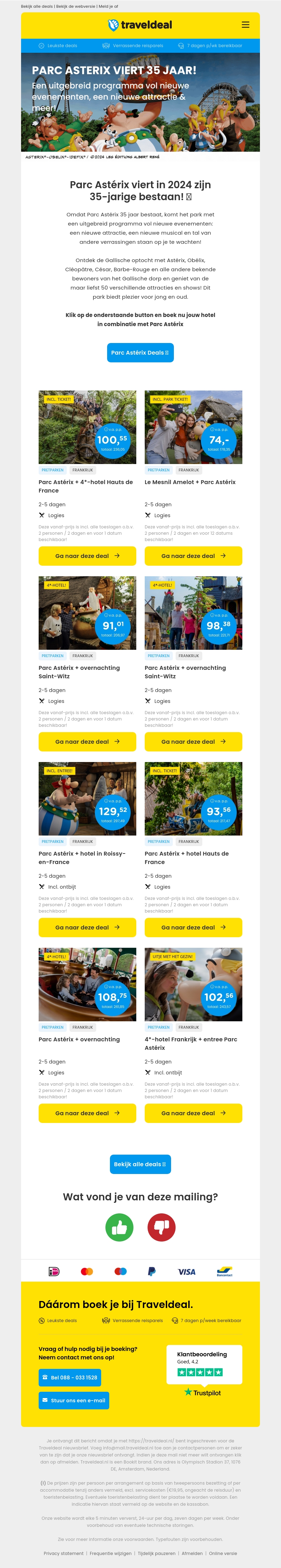 Parc Astérix viert in 2024 zijn 35-jarige bestaan en biedt een uitgebreid programma met nieuwe evenementen, attracties en musicals. Vier mee met Asterix, Obelix en de rest van de Gallische helden. Dit speciale jubileum is de perfecte tijd om te genieten van onvergetelijke momenten in het park, met deals vanaf €74 p.p. plus verblijfopties in verschillende hotels.
