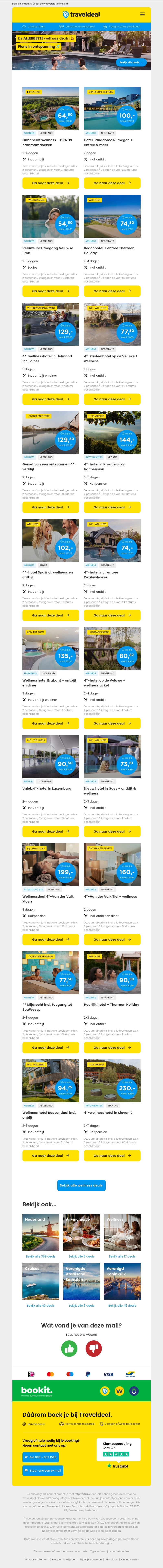 Duik in ontspanning met de allerbeste wellness deals van TravelDeal. Geniet van luxe wellness arrangementen tegen scherpe prijzen. Of je nu behoefte hebt aan een korte spa break of een uitgebreid wellness weekend, wij hebben de perfecte aanbieding voor jou.