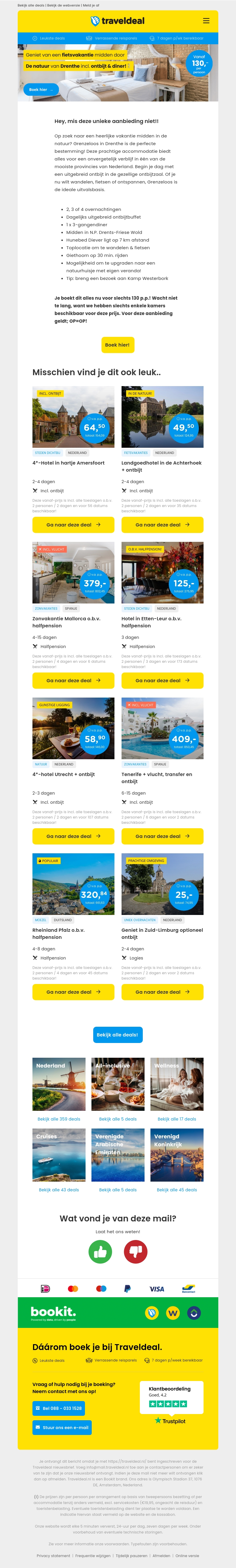Ontdek de prachtige natuur van Drenthe met onze super zomer deal! Boek nu een 3-daagse fietsvakantie inclusief ontbijt en een 3-gangendiner voor slechts €130 per persoon. Ervaar de rust en ruimte van het platteland en geniet van comfort en gezelligheid. Mis deze unieke aanbieding niet!