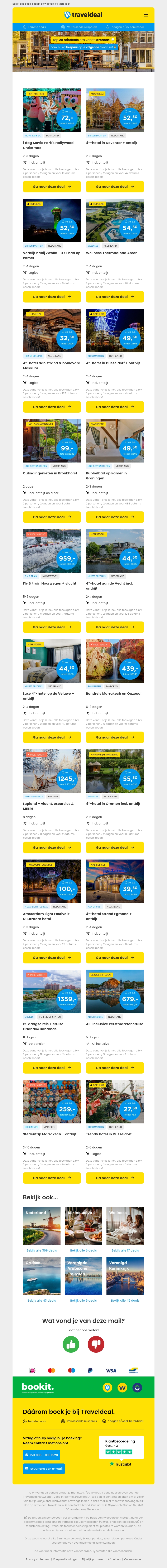 Duik in een wereld vol betoverende reisdeals met Traveldeal. Van een kerstuitje naar Hollywood Movie Park in Duitsland tot een luxe 4-sterren hotelverblijf in Deventer, er is voor ieder wat wils. Laat je inspireren door deze aanbiedingen en plan je volgende avontuur. Met unieke kortingen wordt je droomreis werkelijkheid. Bekijk onze geselecteerde topbestemmingen en maak je keuze. Mis deze kans niet om voordelig eropuit te gaan!
