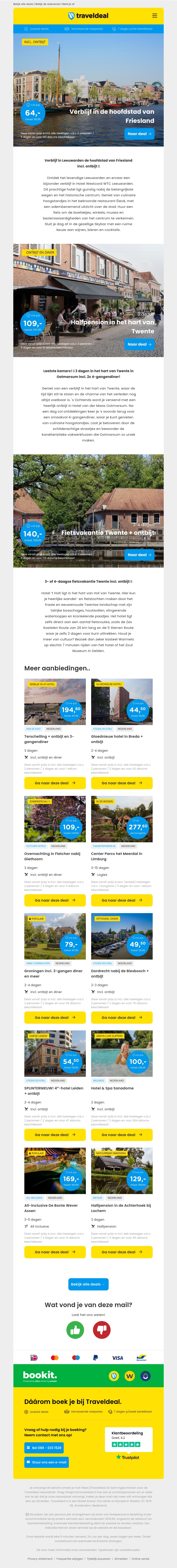 Ontdek de mooiste plekken van Nederland met deze exclusieve deals. Verblijf in Leeuwarden en ervaar de rijke geschiedenis en cultuur van Friesland. Geniet van een luxe verblijf in Twente met halfpension en ontbijt. Plan je perfecte vakantie met een fietsarrangement in Twente of relax in een van de vele andere unieke bestemmingen. Reserveer nu!