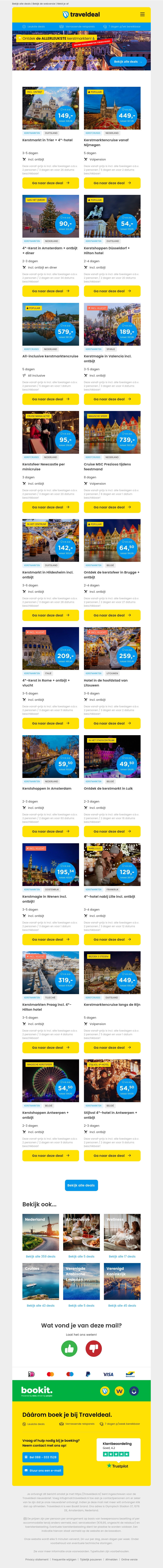 Ontdek de magie van kerstmarkten met Traveldeal! We hebben nieuwe bestemmingen toegevoegd zoals Trier, Amsterdam, Praag, Brugge en meer. Vind de perfecte winteruitstapjes en geniet van unieke kerstsfeer, lokale delicatessen en geweldige aanbiedingen. Mis het niet!