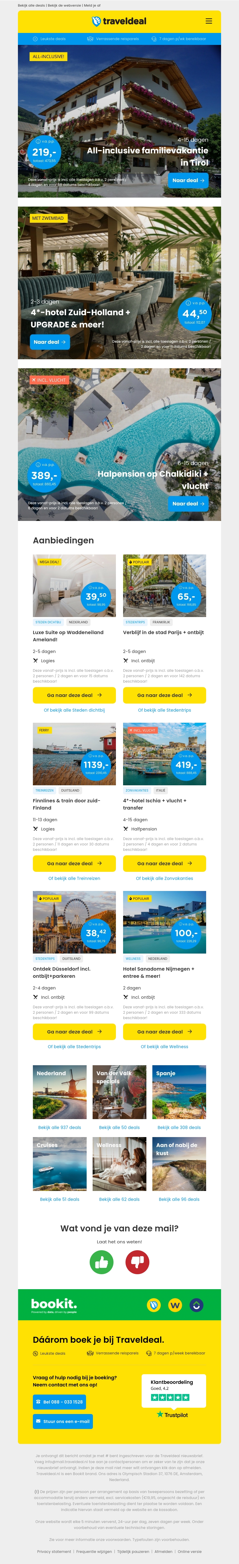Geniet van een ultieme vakantie-ervaring met onze exclusieve aanbiedingen. Verblijf in een luxe 4*-hotel in Zuid-Holland met een speciale upgrade vanaf slechts €44,50 per persoon. Of beleef een fantastische all-inclusive familievakantie in Tirol vanaf slechts €219. Ontdek nog meer aantrekkelijke deals en unieke bestemmingen.