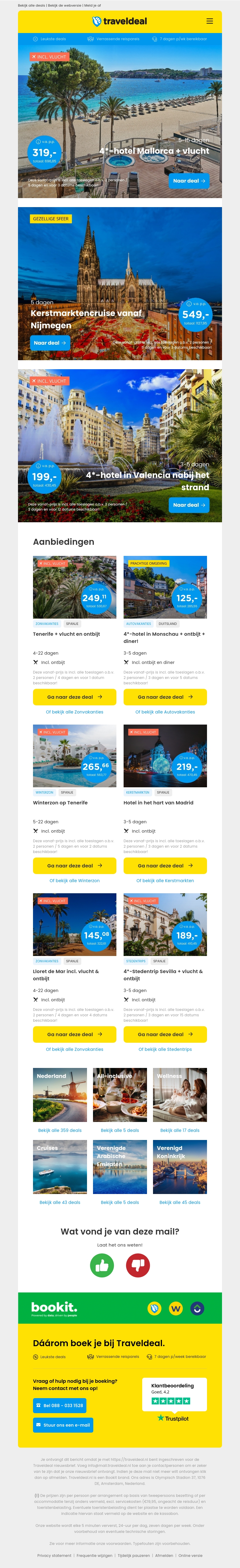 Boek een luxe vakantie naar Mallorca inclusief vlucht en verblijf in een 4-sterren hotel voor slechts €319 per persoon. Of geniet van een sfeervolle kerstmarktencruise vanaf Nijmegen vanaf slechts €549 per persoon. Er zijn nog veel meer aanbiedingen beschikbaar, waaronder hotels in Valencia en Tenerife.