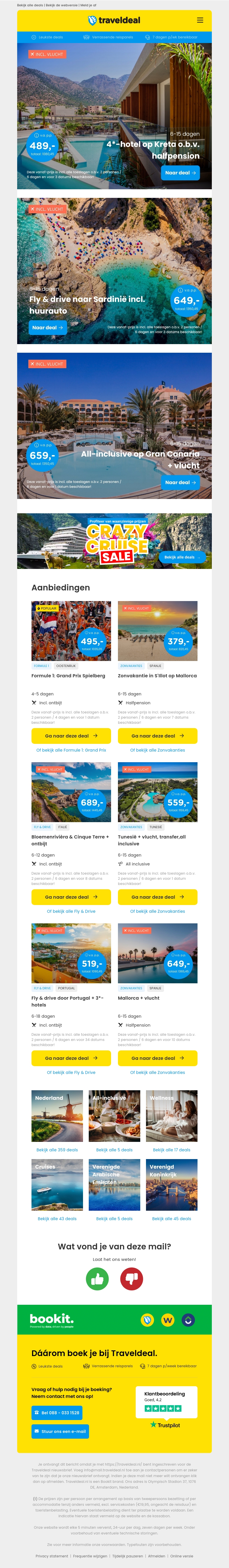 Boek nu je ontspannen vakantie naar Kreta met verblijf in een luxe 4*-hotel inclusief halfpension vanaf €489 per persoon. Ontdek ook Sardinië met een fly & drive deal inclusief huurauto vanaf €649 per persoon. Mis deze geweldige aanbiedingen niet!