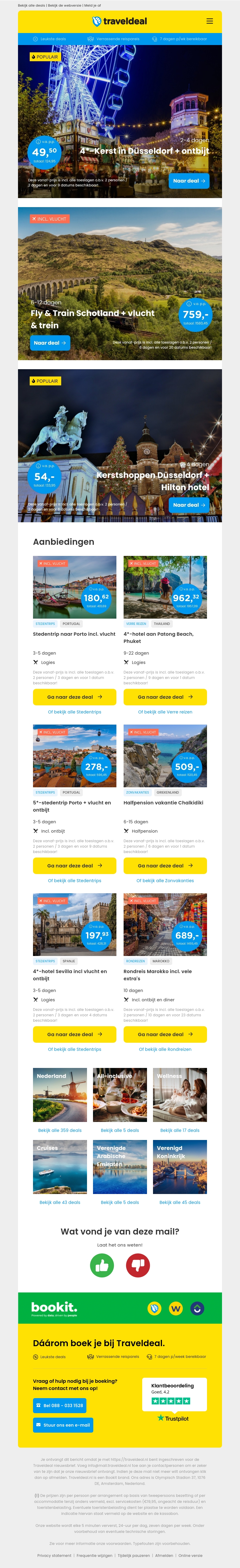 Beleef een magische kerst in Düsseldorf met ontbijt vanaf slechts €49.50 per persoon. Of ontdek Schotland met onze Fly & Train deal inclusief vlucht en trein vanaf €759 per persoon. We hebben ook andere geweldige aanbiedingen voor Porto, Phuket, Sevilla en meer! Mis het niet!