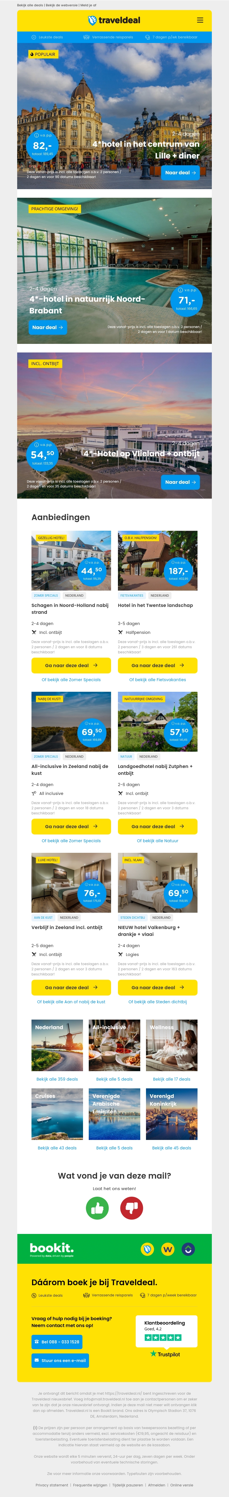 Boek een overnachting in een 4-sterren hotel in het centrum van Lille voor slechts €82 per persoon, inclusief diner. Ontspan in Noord-Brabant of geniet van een heerlijk ontbijt op Vlieland. Ontdek deze en nog veel meer geweldige deals.