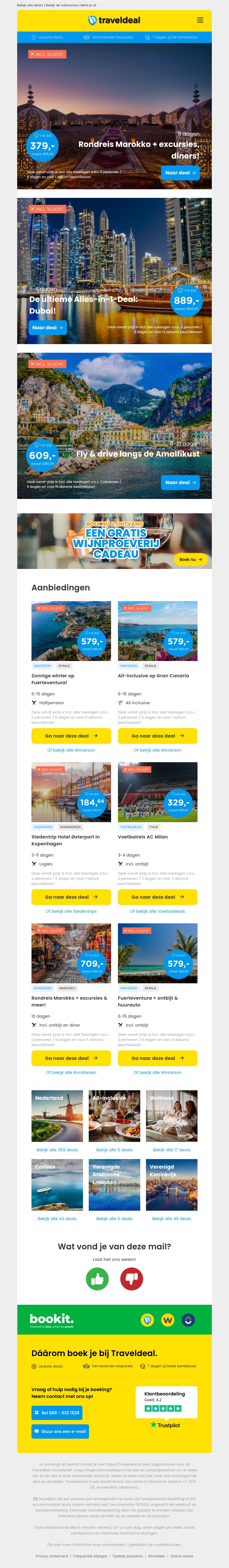 Ontdek een wereld vol reisavonturen met onze nieuwste alles-in-1 deals. Bezoek exotische bestemmingen zoals Marokko en Dubai, of geniet van de schilderachtige schoonheid van de Amalfikust. Of je nu op zoek bent naar culturele ervaringen, zonvakanties, of stedentrips, er is voor ieder wat wils. Vergeet niet om te profiteren van exclusieve aanbiedingen en een gratis wijnproeverij cadeau. Boek vandaag nog en maak onvergetelijke herinneringen!