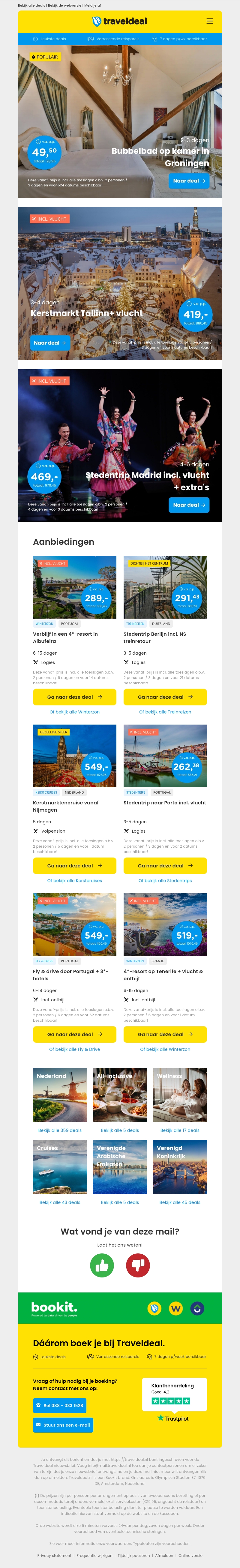 Geniet van een luxueuze ervaring met een bubbelbad op de kamer in Groningen, beschikbaar vanaf slechts €49.50 per persoon. Reis naar de magische Kerstmarkt van Tallinn inclusief vlucht voor slechts €419 per persoon. Ontdek vele andere geweldige reisaanbiedingen, waaronder stedentrips naar Madrid met vlucht en extra's.