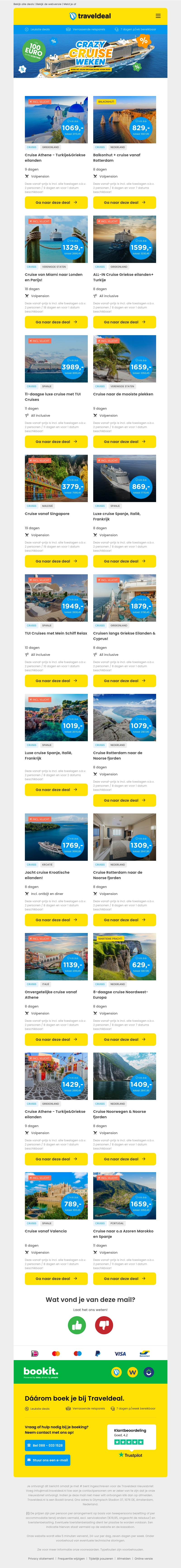 De Crazy Cruise Weken van Traveldeal bieden je fantastische kortingen op diverse cruisevakanties. Geniet van schitterende bestemmingen en voordelige prijzen. De actie loopt bijna af, dus profiteer snel! Of je nu droomt van de Middellandse Zee of het Noorderlicht, er is voor ieder wat wils.