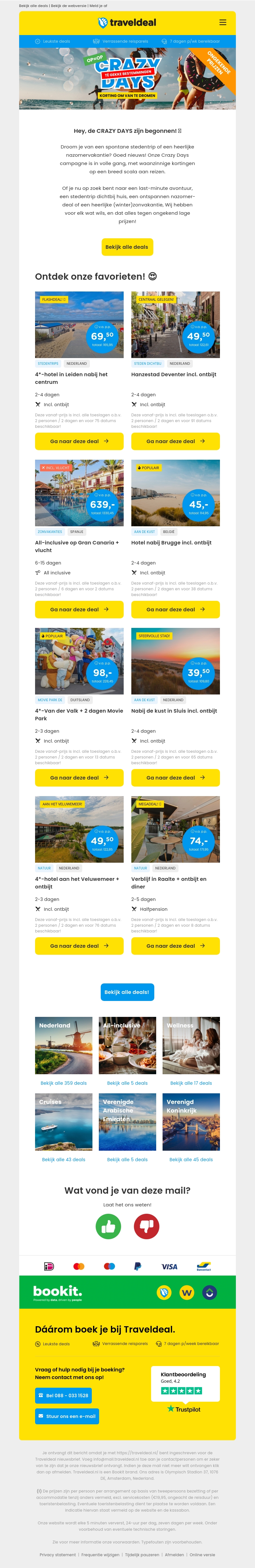 De CRAZY DAYS zijn van start gegaan bij Traveldeal! Profiteer van spectaculaire prijzen op vakanties naar verschillende bestemmingen, zoals Leiden met ontbijt voor slechts €69,50 of Hanzestad Deventer voor €49,50. Mis deze kans niet om voordelig op vakantie te gaan en ontdek al onze deals op de website.