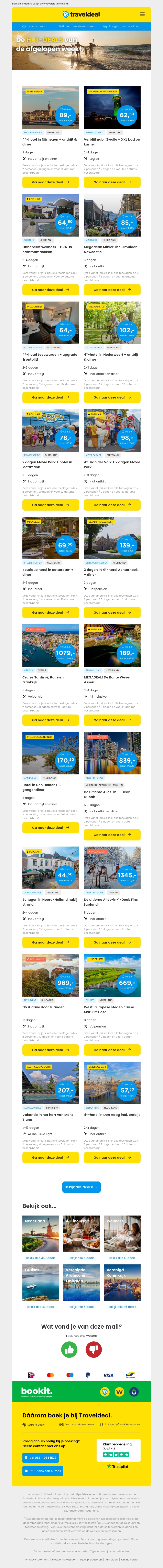 Beleef een onvergetelijke week met onze H☀️T deals! Geniet van een 4*-hotel in Nijmegen inclusief ontbijt en diner voor slechts €89. Ervaar luxe in Zwolle met XXL bad vanaf €62,50. Maak een minicruise naar Newcastle voor slechts €85. Ontdek deze en nog meer onweerstaanbare aanbiedingen.
